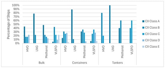 Figure 5. CII class in 2026 of bulkers, container ships, and tankers using HVO, LNG, methanol, and VLSFO marine fuels.