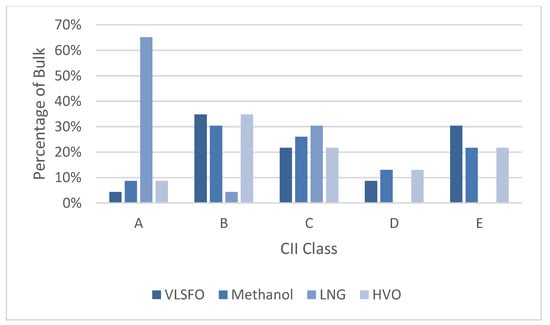 Figure 6. CII class of bulkers in 2030 using LFO, methanol, LNG, and HVO marine fuels.