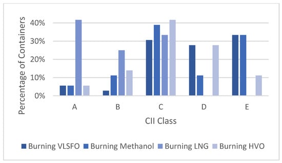 Figure 7. CII class of container ships in 2030 using VLSFO, methanol, LNG, and HVO marine fuels.