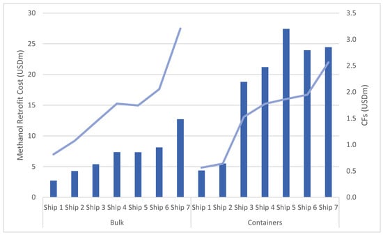 While operational measures offer short-term solutions, shipowners must also consider longer-term strategies, such as transitioning to alternative fuels or retrofitting existing vessels to improve their energy efficiency. Liquefied natural gas (LNG) and methanol are two of the most promising alternative fuels currently available, offering significant reductions in CO2 emissions compared to conventional marine fuels. However, the adoption of these fuels requires substantial upfront investment, particularly for retrofitting existing vessels. For example, retrofitting a bulker to use LNG can cost around USD 101 per deadweight tonne (DWT), while retrofitting a container ship can cost up to USD 4000 per twenty-foot equivalent unit (TEU) (SEA-LNG, 2023; Shipuniverse, 2024).