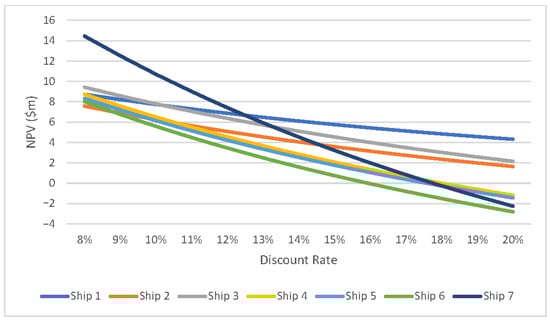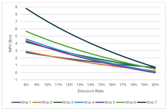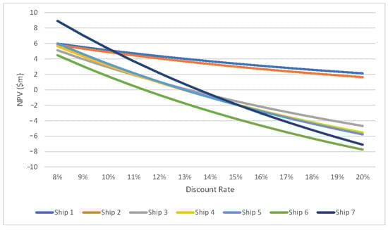Determining the optimal choice among available alternative fuels is critical for achieving CII compliance. Analysis of expected CII ratings for widely available marine fuels identifies LNG and grey methanol as the leading options for improving ratings across all ship types. LNG is optimal for bulkers, while grey methanol is preferable for container ships, provided TC rates increase by at least 20% to offset retrofitting costs and DF engines’ requirement of 3% pilot fuel. Sensitivity analysis of the NPV with respect to the discount rate reveals that LNG retrofits are more sensitive to discount rate changes due to higher cash flows compared to methanol retrofits.