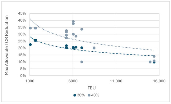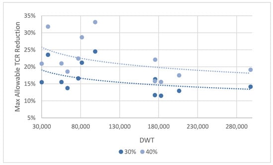 Payload reduction represents a last resort measure for shipowners to keep older ships operational until 2030. Results indicate that reducing payload by 30% and 40% leads to bunker cost reductions of 15% and 20% for bulkers and 12% and 17% for container ships, respectively. These reductions can justify corresponding TC rate adjustments based on ship capacity. However, the imposition of a CO2 tax renders this measure unprofitable.