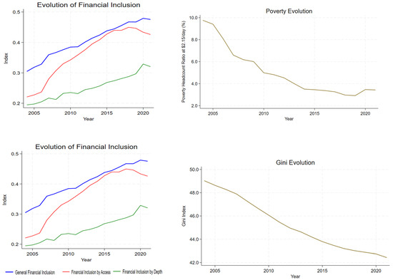 To address this limitation, this study does not limit itself to analyzing the aggregate FI index but instead performs differentiated estimates by its components. Specifically, in this indicator, the access dimension, measured by the number of ATMs and branches per 100,000 adults, serves as a proxy for the minimum physical availability of financial services and can capture more basic forms of financial inclusion, which are more likely to reach larger segments of the population (such as the poorest or rural populations). Meanwhile, the use of the depth dimension, which encompasses the volume of credit extended to the private sector and others, serves as a reflection of the level of activity and maturity of the financial system, facilitating the progressive inclusion of population segments. This methodological strategy enables the identification of the channels through which FI can be linked to poverty and inequality reduction. It avoids drawing aggregate conclusions based on a single composite index.