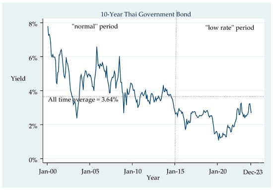 Monthly 10-year government bond yields from 2000 to 2022 will serve as a benchmark for long-term interest rates in Thailand. This data will be used to identify “normal” and “low rate” periods to analyze the effects of a prolonged low-interest rate environment.