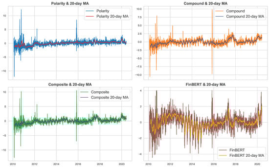 Polarity, Compound, and their Composite sentiment score exhibit broadly aligned trends, marked by noticeable dips during major risk episodes, as shown in Figure 2. These sentiment metrics exhibit smooth cyclical fluctuations, suggesting that they capture gradual changes in sentiment momentum. In contrast, FinBERT displays considerably higher short-term variability and more erratic swings around its moving average. This divergence likely stems from FinBERT’s deeper contextual parsing, which incorporates domain-specific nuances in financial text. Unlike rule-based methods, FinBERT assigns sharper sentiment shifts in response to subtle changes in language, resulting in a higher-frequency signal that is more reactive but also more volatile. Overall, the pronounced spikes in sentiment scores during 2010–2011 correspond to heightened market sensitivity amid pivotal monetary and fiscal developments.