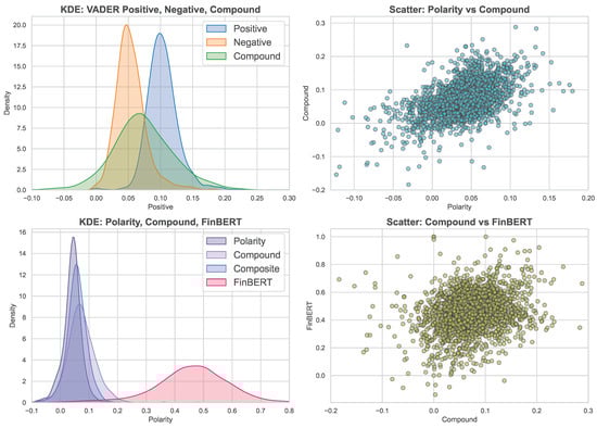 The KDE plots in Figure 3 provide smooth estimates of sentiment score distributions across models. The VADER density shows a bimodal shape. One peak near zero corresponds to frequent neutral to mildly negative sentiment. Another peak around 0.10–0.15 indicates moderate positive sentiment. The compound score has a broader, flatter distribution centered near zero with a slight positive skew. This pattern highlights mixed sentiment in financial narratives, typically balanced or mildly optimistic but occasionally marked by extremes. Comparing all sentiment scores, VADER-centric measures cluster tightly around zero with little skew. This points to a conservative sentiment response. In contrast, FinBERT exhibits a sharper, right-skewed distribution; so it detects stronger positive sentiment more frequently. Polarity and Compound scores appear more symmetric and bounded, whereas the Composite score closely mirrors their combined behavior. These differences reflect methodological variation and thereby support the complementarity of these models in capturing nuanced market sentiment.