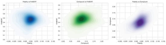 The Compound versus FinBERT plot shows a similar elliptical pattern, with densities peaking around Compound scores of 0.05–0.15 and FinBERT values between 0.3 and 0.7. This reflects a positive but dispersed association, suggesting that although both metrics capture overlapping sentiment signals, FinBERT exhibits a broader dynamic range. The Polarity versus Compound plot exhibits a moderately strong positive correlation, with a Pearson coefficient of approximately 0.54. This indicates substantial but not perfect alignment between these two sentiment metrics, reflecting differences in their methodologies and sensitivity. The clustering along the diagonal suggests consistent directional agreement, yet the moderate correlation signals that each captures unique sentiment nuances. Lastly, the wider spread in comparisons involving FinBERT underscores its distinct modeling approach and sensitivity to context.