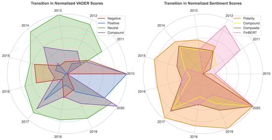 Finally, it is also interesting to look at the temporal evolution of the average annual stock market sentiment over the observed period (see Figure 5). The first radar chart (left) illustrates the annual transitions in normalized VADER sentiment subscores (2010–2020). Over this period, Neutral sentiment consistently dominates, indicating that financial news generally maintains a balanced tone with limited emotional extremes. Positive sentiment maintains a steady presence but shows marked fluctuations, including a subtle decline during the 2011–2012 stress period and a pronounced spike in 2020 driven by optimistic market trends.