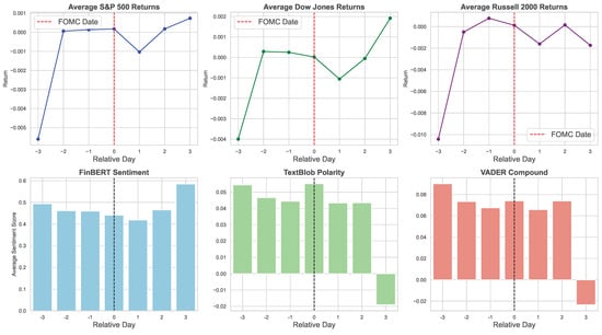 We can also connect the fluctuations in sentiment scores with those of major market indices around these events, as presented in Figure 6, Figure 7 and Figure 8. The FinBERT sentiment score exhibits a distinct U-shaped pattern around FOMC announcements (see Figure 6), decreasing gradually from three days before to the event day, followed by a sharp recovery in the subsequent days. In contrast, both TextBlob Polarity and VADER Compound scores display a subtle W-shaped trajectory, with mild rises and falls prior to the event and a pronounced decline on the third day after the announcement. Regarding market returns, all three indices experience a sharp increase in the days leading up to the announcement. This is followed by a marked decline immediately after the event. Subsequently, the S&P 500 and Dow Jones recover rapidly, whereas the Russell 2000 shows a more volatile pattern with an initial rebound followed by a renewed decline. These dynamics reflect the evolving investor sentiment and market uncertainty around monetary policy releases, highlighting heterogeneous responses across sentiment models and market segments.