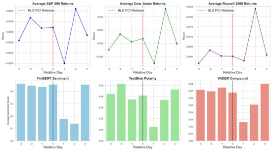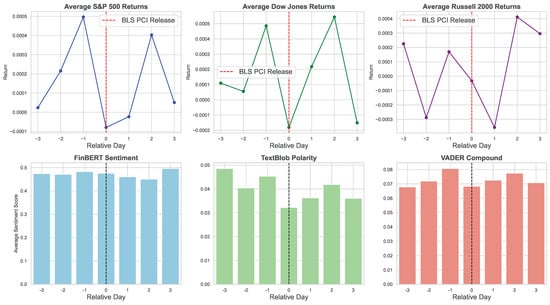 The sentiment scores around BLS PCI release dates (day 0) exhibit relatively stable dynamics within the day window. FinBERT scores fluctuate moderately, beginning near 0.47 at day , peaking at day around 0.48, and dipping slightly around the event day and following days, with a recovery to approximately 0.50 by day 3. Polarity scores remain low throughout, generally ranging between 0.03 and 0.05, with a slight dip on the event day to about 0.03, suggesting limited shifts in overt sentiment polarity. Compound scores display moderate variation, peaking slightly before the release at 0.08 and decreasing slightly at day 0, then stabilizing around 0.07 thereafter. Overall, these patterns suggest that sentiment responses to BLS PCI news releases are subtle and mostly balanced. Comparatively, FinBERT captures slightly more nuanced fluctuations compared to Polarity and Compound scores. Its ability to interpret financial jargon and complex sentence structures likely contributes to capturing these finer variations in market sentiment.