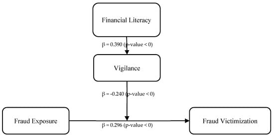 After validating the predictive power and model fit, we analyzed the effects of the constructs on victimization likelihood. This study seeks to determine the generalizability of these effects from our sample to the broader population. Therefore, it is essential to examine the magnitude, direction, and significance of path coefficients (Ali et al., 2018; Henseler et al., 2016). To assess the statistical significance of the path coefficients, we employed the bias-correlated and accelerated (BCa) bootstrapping resampling method with 10,000 resamples, as recommended by Ali et al. (2018) and Streukens and Leroi-Werelds (2016). The results of the path coefficients are presented in Table 8, whereas Figure 2 visually depicts the relationships between the constructs in the model. Our analysis finds that fraud exposure exhibits a positive and significant correlation with fraud victimization (β = 0.296, p < 0.05). This suggests that the likelihood of becoming a victim of financial crime increases with the increasing intensity of fraud exposure. Subsequently, vigilance is found to have a negative relation with fraud victimization (β = −0.320, p < 0.05), indicating that individuals exhibiting greater vigilance are less likely to fall victim to fraud. Furthermore, vigilance negatively moderates the relationship between fraud exposure and fraud victimization (β = −0.247, p < 0.05), suggesting that individuals with higher levels of vigilance exhibit a lower likelihood of becoming victims of financial scams, despite being exposed to intense fraudulent activity. Furthermore, we documented that financial literacy is positively related to vigilance (β = 0.390, p < 0.05). Someone’s level of vigilance increases as their knowledge of financial products, services, and markets improves. Therefore, the government and financial service providers must collaborate to enhance public financial literacy. This action can help people to avoid financial crimes, even when they are intensively exposed to fraudulent activities.