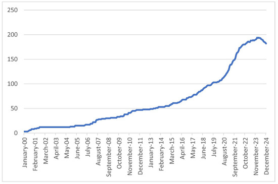 We analyzed the performance of data center exchange traded funds (ETFs) based on monthly return data obtained from Morningstar Direct. In January 2000, we had only three data center ETFs, and the number of ETFs increased to 180 by December 2024. All ETFs included in the sample are actively managed. As of December 2024, the average turnover ratio of these funds was 87.13%. The average annual adjusted expense ratio was 0.52% of the average ETF in December 2024. Historical trends show that the average expense ratio has increased from 0.35% in 2006 to 0.52% in 2024. The average turnover ratio has increased from 27.34% in 2000 to 75.66% in 2024. Total assets under management (AUM) for the sample of U.S. data center ETFs was $314 billion as of December 2024. The average size of the ETF in the sample was $1.6 billion in December 2024. Average AUMs have continued to increase, with active ETFs seeing an increase in average assets from $22 billion in 2022 to $24 billion in 2024. Figure 1 shows the growth in the number of data center exchange traded funds since January 2000.