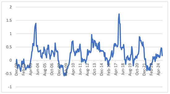 Over the full sample period from January 2000 to December 2024, the selectivity coefficient (αs) is estimated at 0.09, though this value is not statistically significant (t = 0.73). This suggests that data center ETFs did not exhibit meaningful stock selection ability across the long term, echoing the earlier findings from Table 4, Table 5 and Table 6 where alpha estimates were flat or negative. In essence, the ETF portfolios tracked broad market patterns without consistently adding value through superior asset selection.