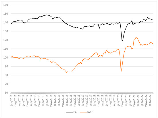 Comparison between the economic activity index (EAI) and the composite leading indicator of the economy (IACE) from January 2011 to December 2022. Source: Prepared by the authors. Data available in https://ciclo-economico-ibre.fgv.br/ (accessed on 25 November 2022).