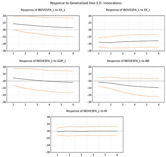 Using the econometric package in the E-views 12 software, impulse response functions were generated to simulate a hypothetical shock of one standard deviation in the leading cyclical indicator (EA_L), the exchange rate (ER_L), the economic activity (GDP_L), inflation (INF) and Selic rate (IR), to see if they could influence the behavior of IBOVESPA within a 6-month horizon. It is important to highlight that, in order to reduce possible differences in the results resulting from the ordering of the variables, the present research used generalized impulse response functions to the detriment of ordering, based on the Cholesky method.