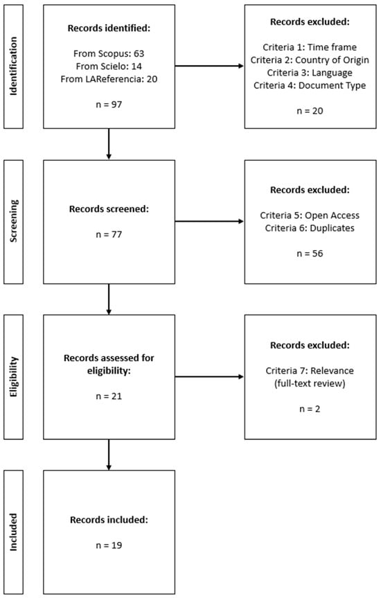 The availability of free access to the preselected articles through Scopus was assessed. However, due to editorial policy restrictions, some studies could not be freely downloaded. Consequently, 13 records were excluded, leaving 22 articles eligible for analysis. The use of an open-access filter was based on practical considerations of accessibility and transparency. Given that many institutions and researchers in Latin America face restrictions in accessing paywalled journals, focusing on open-access sources ensures that the reviewed literature is broadly available for verification, replication, and policy translation. Nonetheless, we recognize that this filter may have excluded high-impact publications that are not freely accessible, which is a limitation we acknowledge and recommend addressing in future research with broader access privileges.