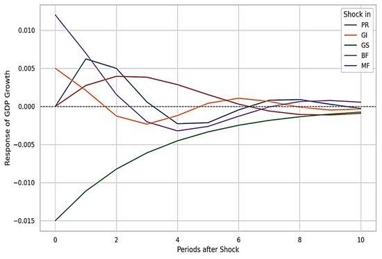 When combined, the Bayesian VAR findings support the idea that internal economic inertia is the primary factor influencing short-term GDP growth. After accounting for dynamic feedback, structural and fiscal factors seem to have comparatively small direct effects. Nonetheless, the slight importance of fiscal and trade openness metrics suggests that they might be used as amplifiers or transmission channels during times of economic adjustment. The results support the GMM estimation and show that fiscal policy and institutions are important, but their effects might be more noticeable over longer time periods or in conjunction with cyclical dynamics (see