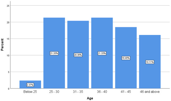 The findings, presented in Figure 3, indicate that the 25–30 and 36–40 age groups were equally represented, each comprising 21.3% of the sample. The 31–35 age group followed closely at 20.4%. This distribution suggests that the workforce in the Free State banking sector is predominantly composed of young and middle-aged employees, with a significant proportion falling within the youth category.
