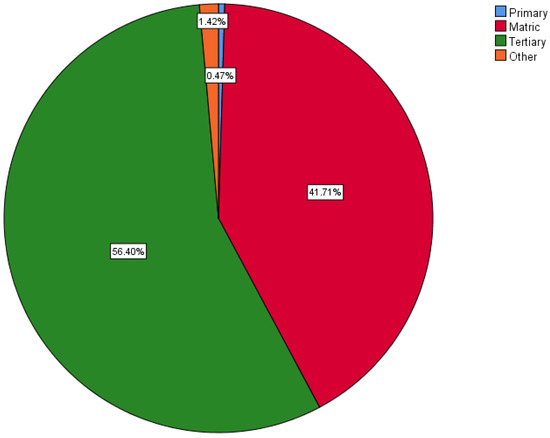 Education serves as a foundational element in the pursuit of multiple Sustainable Development Goals (SDGs), including Goal 1 (No Poverty), Goal 8 (Decent Work and Economic Growth), Goal 16 (Peace, Justice and Strong Institutions), and Goal 17 (Partnerships for the Goals). It enhances individual capabilities, institutional effectiveness, and societal resilience, making it a critical factor in assessing inclusivity and accessibility within the banking sector. The findings, as illustrated in Figure 4, reveal that most respondents (56.4%) possess tertiary qualifications, while 41.7% have attained matric-level education. A small minority reported educational attainment below the matric level. These results indicate that the Free State banking sector has strategically invested in an educated workforce, particularly among the youth, thereby positioning itself as a key enabler of sustainable development.