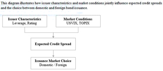 These hypotheses suggest that issuance location is chosen in anticipation of pricing outcomes and risk perceptions, not in isolation. Figure 1 presents a conceptual framework that summarizes the hypothesized relationships developed in this section. It illustrates how issuer characteristics (e.g., leverage and rating) and market conditions (e.g., USVIX and TOPIX) jointly influence expected credit spreads, which, in turn, affect firms’ decisions to issue bonds in domestic or foreign markets.