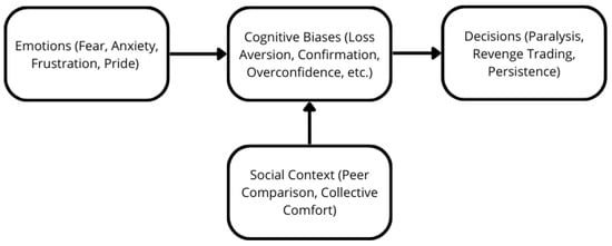 For this purpose, we propose a conceptual framework where (i) emotions act as precursors that result in biases, (ii) biases influence specific decision patterns (e.g., paralysis, “revenge” trading or persistence with unsuitable strategies), and (iii) social interactions moderate these processes. This framework contributes to the literature by highlighting not only what investors feel and do but how and why these dynamics emerge.