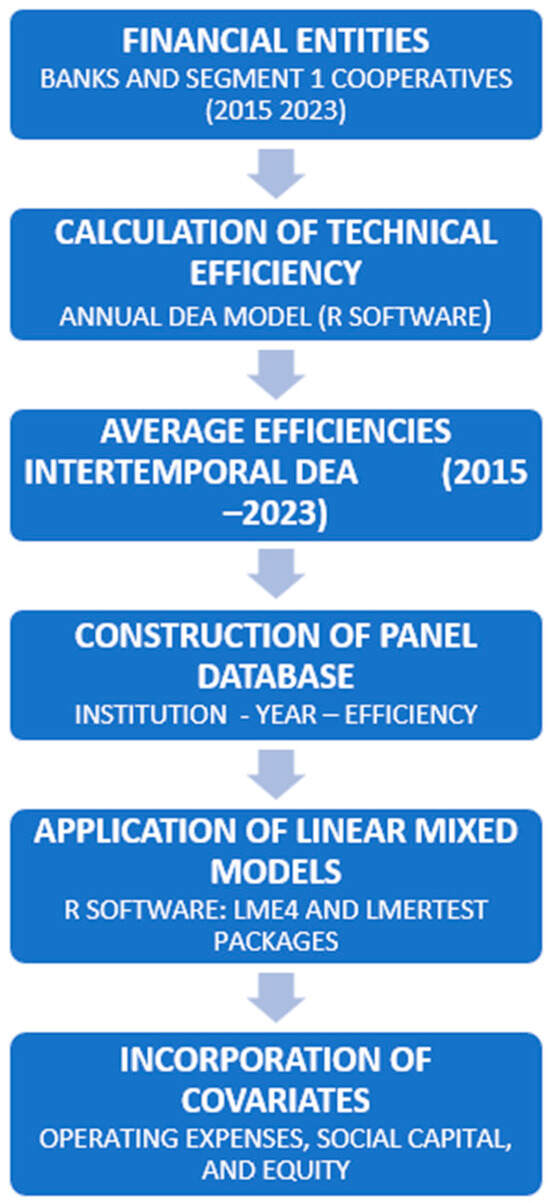 This study was conducted using a quantitative approach, with an observational, retrospective, and longitudinal design. The research was structured in the following three methodological phases: first, the technical efficiency of financial institutions was estimated using the Data Envelopment Analysis (DEA) model; second, the evolution of this efficiency over time was analyzed using mixed linear models (MLMs); and finally, the impact of structural financial management variables on the observed efficiency levels was evaluated.