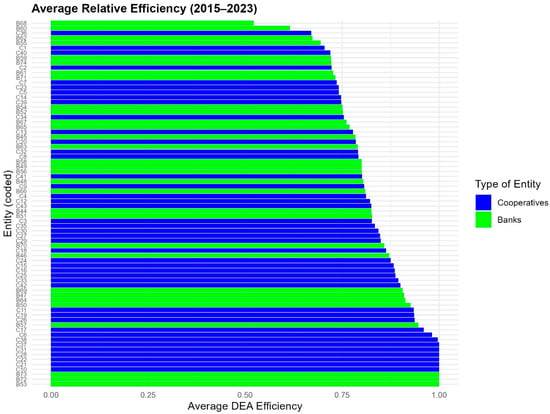 Mean relative efficiency across institutional type (2015–2023). Source: Prepared internally based on data processed from the DEA model.