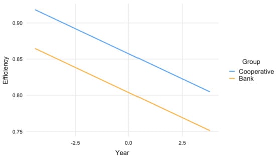 The interaction between group and year was relevant, indicating that the efficiency trajectories of banks and cooperatives did not evolve in parallel. Specifically, the decline in efficiency during 2020 and 2021 was more pronounced in banks, while cooperatives showed greater operational resilience.
