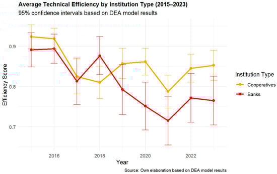 The results of the DEA model reveal that, on average, savings and credit cooperatives showed a higher technical efficiency than private banks during the period of 2015–2023. Over time, both efficiency curves show a similar evolution: a sustained upward trend until 2019, followed by a significant decline in 2020 and 2021, coinciding with the economic impact of the COVID-19 pandemic.