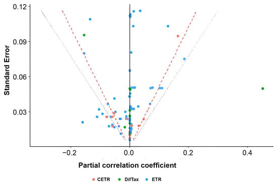 The partial correlation coefficient r is equal to the coefficient of i from study j, as shown in Equation (2). The precision of the partial correlations is represented by P. The weighted partial correlation coefficient indicator is used to answer two questions: (1) Is there evidence of strategic interactions in corporate taxation across firms? (2) How large is this effect? According to H. Doucouliagos’ (2011) guidelines, the absolute value of the partial correlation is evaluated as follows: below 0.07, the effect is small; between 0.07 and 0.17, the effect is moderate; above 0.33, the effect is large. Positive values of the partial correlation indicate that governments’ tax policies move in the same direction as those of their neighboring jurisdictions, which constitutes “competitive behavior”. Conversely, negative values indicate “reverse behavior”, where a government’s policies act as a “counterweight” to the policies of its neighbors (Overesch & Rincke, 2009; Parchet, 2019). The partial correlation index is, therefore, a useful tool for assessing the degree and direction of tax behavior in an international environment.