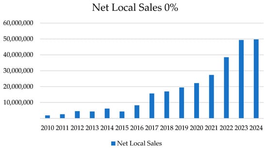 The following Figure 5 presents the evolution of net local sales taxed with 0% VAT from 2010 to 2024, reflecting sustained growth, especially from 2016 onwards. In 2022, 2023, and 2024, a stagnation in the maximum value is observed, exceeding 50 million, which denotes a stabilization of the market or production volume. The notable increase in net local sales indicates a steady expansion of the poultry sector in Tungurahua. This growth may be associated with increased demand for poultry products (eggs, chickens, by-products), reflecting their importance in the local economy.