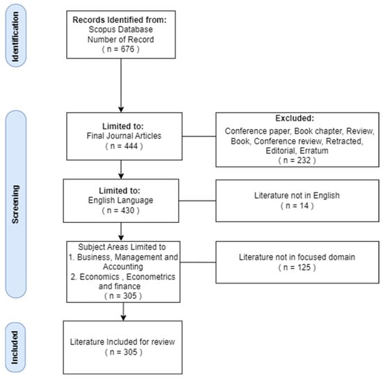 The final screening step focused on the relevance of the subject area. Since this research aimed to examine fintech investment risk from a business and management perspective—rather than from a technical or engineering viewpoint—the subject areas were limited to “Business, Management and Accounting” and “Economics, Econometrics and Finance”. This thematic refinement excluded 125 articles that did not align with the research’s disciplinary focus, leaving 305 articles for inclusion.