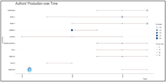 The figure illustrates the increasing frequency and visibility of authors’ contributions, reflecting the expanding scope and ongoing interest in this research field. It highlights how diverse authors’ contributions continue to grow, showcasing the sustained relevance of this area over time.