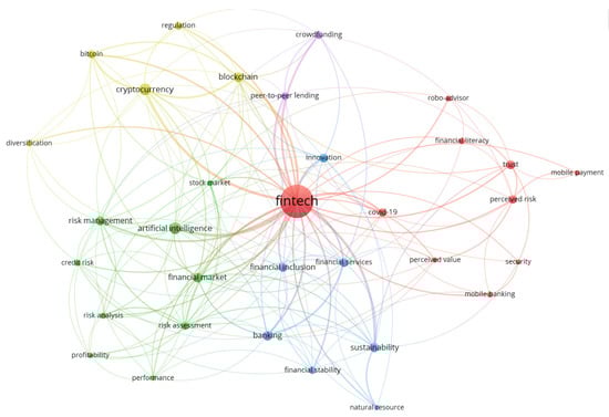 The network consists of blue, green, and red clusters, as demonstrated in Figure 8. The blue cluster on the upper left represents researchers who focus primarily on fintech regulation, crowdfunding, and financial inclusion. For example, strong co-citation patterns may be indicated by their influential collaborative work on digital financial regulation, financial inclusion, and sustainable development through the implementation of digital infrastructure (Arner et al., 2020; Buckley et al., 2020).