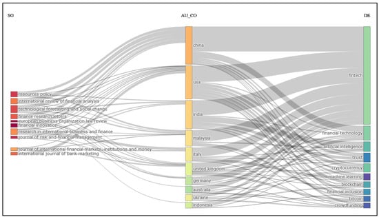 Regarding production over time, a line chart tracks the cumulative number of articles published by various journals, as shown in Figure 3. The shape of the curve shows the growth pattern of article publication in that journal over time. A steep incline indicates a burst of publications in that period, while a flat line implies no new articles added. The chart illustrates how selected journals have contributed to the literature over time. Financial Innovation (olive) achieves the highest cumulative output by examining innovations across technological advancements and connecting researchers with practitioners, thereby advancing knowledge of new instruments, technologies, and financial artifacts. The Journal of Risk and Financial Management (blue) demonstrates transformative acceleration in examining finance, economics, and risk through a technological lens, highlighting innovation while supporting research on facets of financial and risk decision-making. Technological Forecasting and Social Change (magenta) has shown a marked increase in publications recently, highlighting forward-looking methodologies that analyze the interconnections between social dynamics, environmental concerns, and technological developments, such as planning instruments. Research Policy (purple) exhibits a sharp upward trend, highlighting its focus on innovation, technology, and research, which interact with organizational processes to generate insights into policy development and management practices.