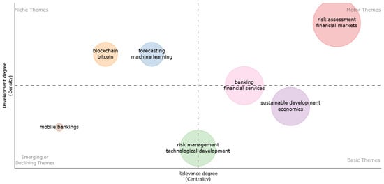 The red cluster, which is on the left, centers on applied banking and management. Prominent journals like the International Journal of Bank and Management Science exemplify this cluster’s focus on practical applications, risk management, and operational aspects of financial institutions. These publications typically address real-world banking practices and managerial decision-making in financial contexts (Hong et al., 2024; Le et al., 2024).