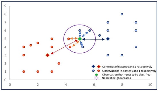 where d(p, q) is the distance between points p and q. The points p and q can be the new point to be classified (p) and the nearest neighbors or the centroids (C0 and C1) of each group (q); e is a small rational number used to prevent division by zero, and k is a hyperparameter of the proposed model, determined during model training.