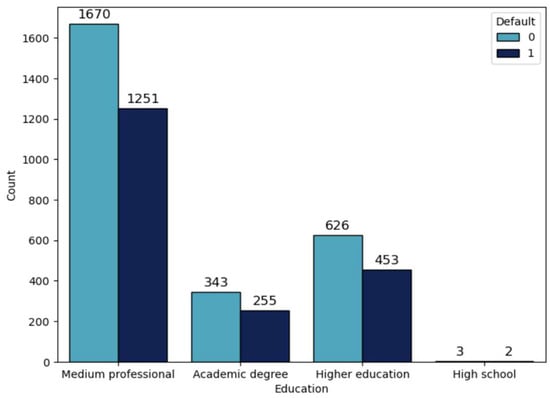 Within the framework of this research work, various variables were analyzed which showed that default is evident in the age group of 20–25 (50.49%, Table 3, Figure 2), as well as in the group of customers that have real estate (44.36%, Table 4, Figure 3) and in the group of customers that have medium professional education level (42.83%, Table 5, Figure 4).