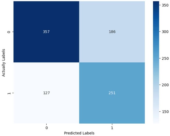In Figure 6, the confusion matrix of the built model is presented, from which it is evident that the model revealed around 66% of defaults (251/378); at the same time, it refuses 186 good customers, which is around 34% (186/543) of the good customers in the test subset (Dyrland et al., 2023).
