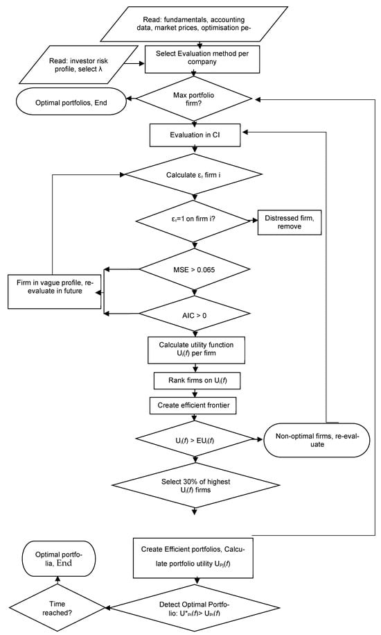The evaluation υγ in (33) is more important than the investor’s risk behavior, as they have a reverse influence on υγ/λ. The minx f(x) equality in (34) declares that the categorical, objective influence of an asset is more influential than subjective investors’ behavior. The flowchart of the processes is shown in Figure 1.
