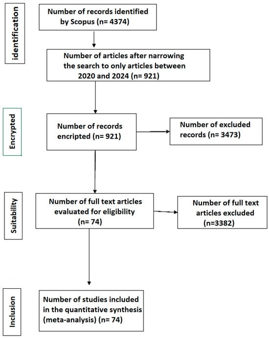 It is important to mention the implementation of an automatic classifier and internal or external validation in order to reduce the risk of erroneously classified studies as expressed in the PRISMA 2020 declaration; for this, the use of Microsoft Excel is implemented for the creation of a classification table, which brings together relevant criteria for each study, allowing the correct classification that leads to relevant and pertinent results. Subsequently, in order to carry out a more precise analysis of the information, we proceeded to debug those studies that did not meet the necessary criteria for the performance of this research work. After applying the inclusion and exclusion criteria, 921 studies were found; to this end, filters were applied that took into account studies published in the range from 2020 to 2024, which are scientific articles, allowing the centralization of 74 studies of greater relevance. As shown in Figure 1.