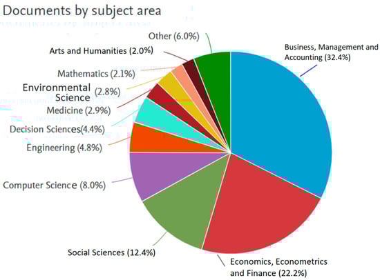 Figure 3 shows the percentage (%) of published documents classified by subject area. It is evident that most of the studies are oriented to the fields of business, management, and accounting with 32.4%, followed by economics, econometrics, and finance with 22.2%, and finally social sciences that represent 12.4%, with respect to the total of 4374 studies published. Among these documents, we highlight Lee et al. (2020) for their approach in describing the challenges faced by auditors when implementing data analysis in their audit processes: much of the data provided by clients or in noncompliant files is incomplete. It is important to mention that most of the studies are scientific articles with 72.5%, followed by conference papers with 11%, and finally book chapters with 6.6%, with respect to the total of 4374 studies published.