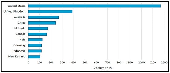 Figure 4 shows the number of academic studies that have been produced in different countries of the world regarding the topic of financial auditing. The result shows that the United States leads with 1169 published studies. It is also followed by countries such as the United Kingdom and Australia with 389 and 270 publications, respectively. On the other hand, there are other countries that also contributed with studies, although in a smaller proportion; they include China with 242, Malaysia with 171, Canada with 163, and India with 125, among others.
