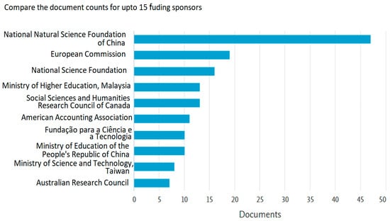 Figure 6 shows the organizations that funded the researchers’ academic studies. It is noted that the National Natural Science Foundation of China sponsored 47 studies, being the institution that funded the largest study. On the other hand, there are other institutions that also contributed, although in a smaller proportion, such as the European Commission and the National Science Foundation, which supported 19 and 16 studies, respectively. This leads us to ask who should be the main funder for this type of research, regardless of the country or region where the organization is located, or if it should be the organization itself that is in charge of ensuring the constant construction of research on financial audit values, in order to promote the development and internal improvement practices.