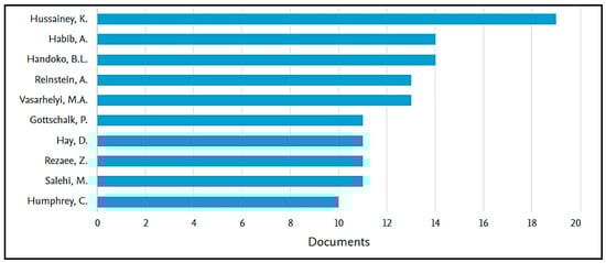 Figure 7 shows the researchers who conducted studies on financial auditing. As can be seen in the graph, Hussainey, K. is the author who carried out the largest number of studies with 19 publications throughout these years, demonstrating that this topic is of great interest to him. In addition, both Habib, A. and Handoko, BL published 14 studies and Reinstein, A. published only 13 studies. Alharasis et al. (2024) highlights the relevance of the disclosure of key information to improve the quality of audits, clarifies a devastating impact in terms of the complexity evidenced by the risks of the audit itself, and generates a need for complementary services to define high quality in the processes. In their research, they promote the application of empirical studies and the transmission of the effects of the disclosure of information to improve the quality of the audit by internal or external auditors, because most studies in this field arise from a highly regulated system.