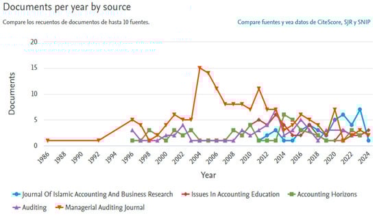 Figure 8 shows the various sources from which information was extracted for the preparation of academic studies according to the year of publication. It is observed that the Managerial Auditing Journal is a source of information that contributed to the preparation of 169 studies in a range from 1986 to 2024, reaching 15 studies published in 2004 alone, being the most relevant figure. On the other hand, other sources that also contributed, although in smaller quantities, are Auditing, Accounting Horizons, and Issues in Accounting Education with 60, 53, and 47 studies. This concept of a relationship with the Managerial Auditing Journal is interesting because it is a journal related to auditing and assurance services. Likewise, its relationship with other topics such as professional judgment, decision-making, risks, technological advances, governance, ethics and global development point in the same direction and contribute to strategic decision-making.