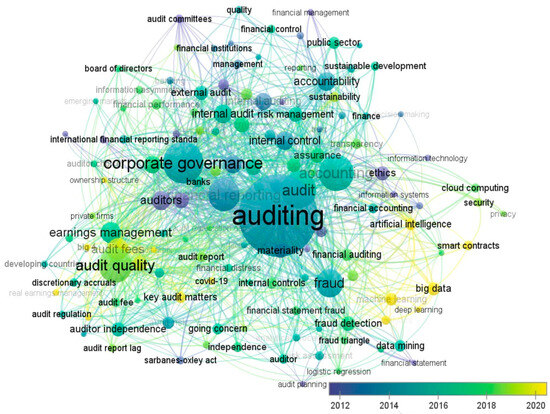 Figure 9 presents the network map based on co-occurrences, which was prepared with the VOS viewer program, to analyze the existing literature on financial audit studies, organized by year, which is useful to understand the evolution of the topic. This allowed us to visualize the terminology most used by researchers. It is evident that since 2012, “corporate governance” is frequently mentioned to refer to accountability to stakeholders, “fraud” alluding to the manipulation of financial information, and “internal control” in relation to risk management. On the other hand, from 2016 the term “quality audit” was coupled and after 2018 the concepts “Big Data”, “data analysis”, and “artificial intelligence” appeared oriented to the evolution of technology and the need for the auditor to analyze large volumes of data and the detection of anomalies.