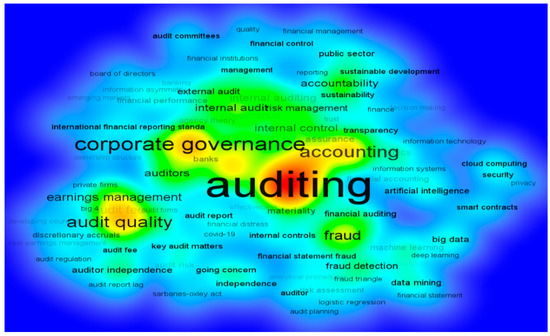 Figure 10 shows a heat map showing the areas where the terminology used by the authors is most predominant. Areas covered by warm colors indicate the high frequency of words such as audit, corporate governance, audit quality, and fraud. It is necessary to bring up Jannat (2022) due to the breadth of his research because the objective was to determine the source variables of the investigative gap in auditing, with a relationship between authors, auditors, and individual investors; in this sense, the variables with the greatest weighting are internal control and fraud arrest, and it seems that the final meaning of implementing a financial audit process is the same: to prevent fraud and promote transparency. At the end of the same study, the disparity between auditors and investors in two variables is revealed: internal control and reliability. According to them, these are gaps that can be reduced by generating financial knowledge and education on work ethics in employees.