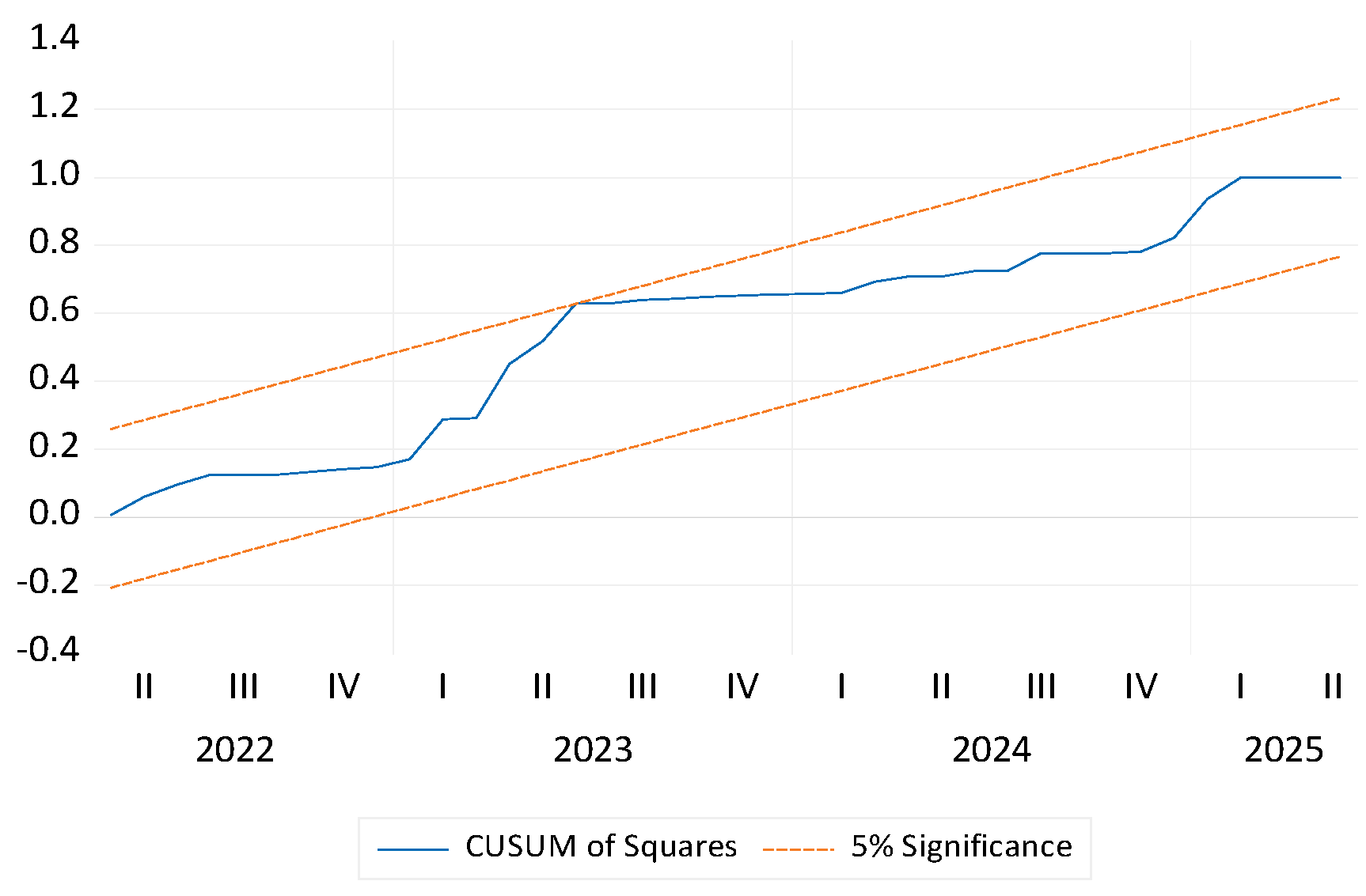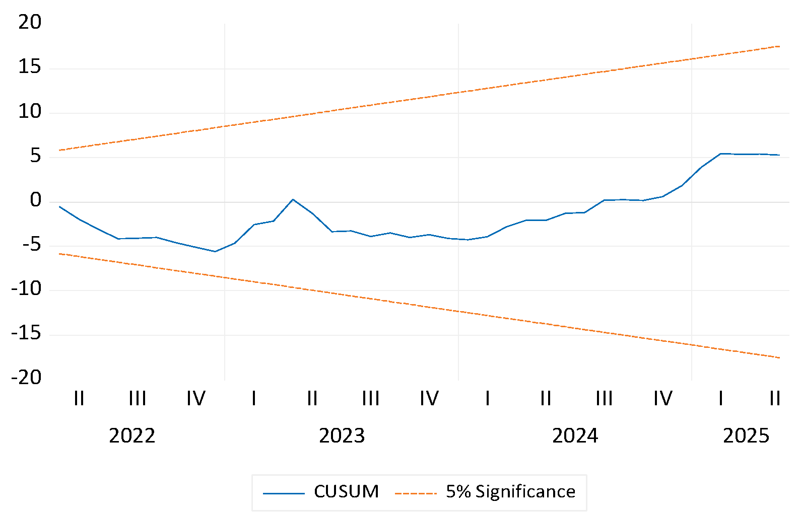 Diagnostic tests are subsequently performed to ensure model adequacy, including serial correlation (Breusch–Godfrey LM), heteroskedasticity (Breusch–Pagan–Godfrey), and functional form misspecification (Ramsey RESET). Structural stability is examined using the CUSUM and CUSUMQ tests, following
