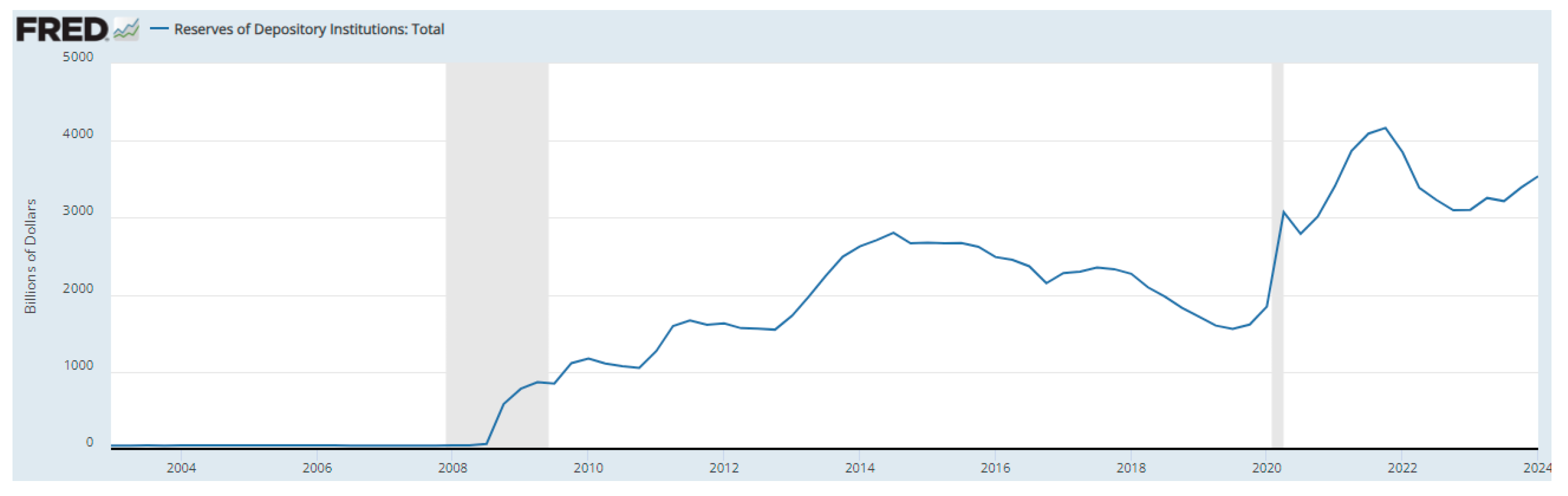 Figure 2. Commercial Bank Reserves Held at the Federal Reserve Banks. Shaded areas indicate recessions. Source: Federal Reserve Bank of St. Louis FRED.